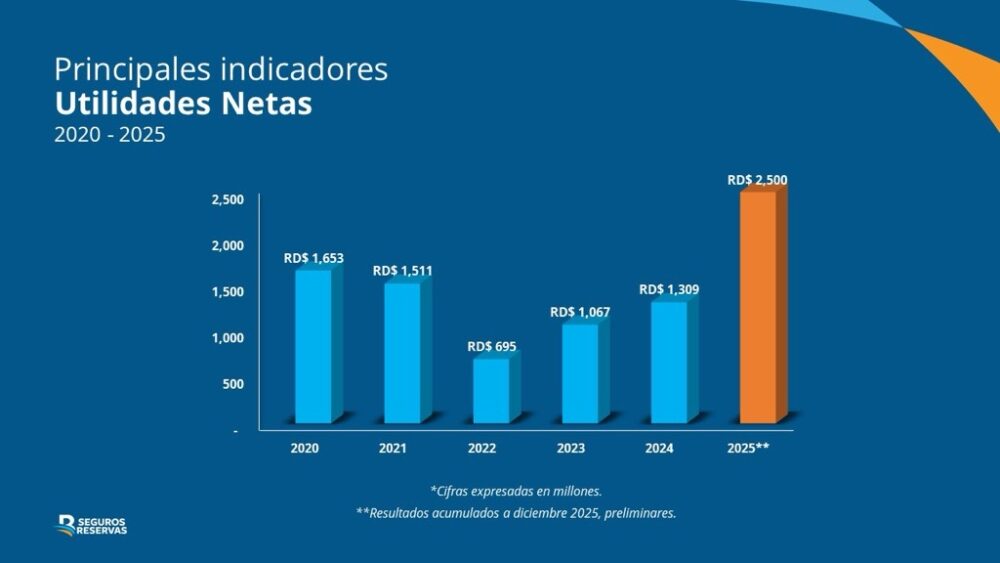 Durante el período enero-diciembre del 2025, la aseguradora registró un incremento de 96% en sus utilidades netas al pasar de RD$1,309 millones a diciembre de 2024, a un preliminar de RD$ 2,500 millones para el período 2025.