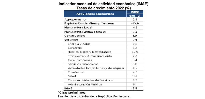 El indicador mensual de actividad económica (IMAE) registra una variación promedio acumulada de 5.5 % en el periodo enero-julio 2022 en comparación con igual período del año anterior, luego de haber experimentado un aumento interanual de 4.7 % en el mes de julio, similar a las tasas de crecimiento de abril y mayo de 4.7 % y 4.8 %, respectivamente.