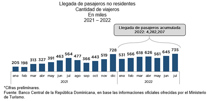 Asimismo, se destaca la afluencia en el mes de julio de 735 mil turistas, un máximo histórico que supera en 30.3 % la llegada de pasajeros en dicho período del año anterior, según las informaciones oficiales ofrecidas por el Ministerio de Turismo.