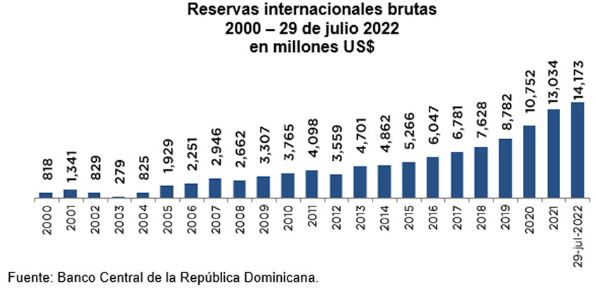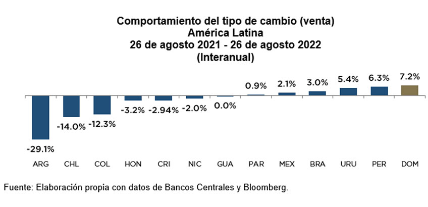 En ese sentido, la evolución positiva de las actividades generadoras de divisas, incluyendo la entrada de remesas por US$5,669.7 millones en enero-julio de 2022, favoreció la estabilidad relativa del tipo de cambio, reflejada en una apreciación acumulada de la moneda local de 5.3 % al cierre de julio y que ha superado el 7 % hasta la última fecha disponible de agosto, tanto en términos acumulados como interanuales.