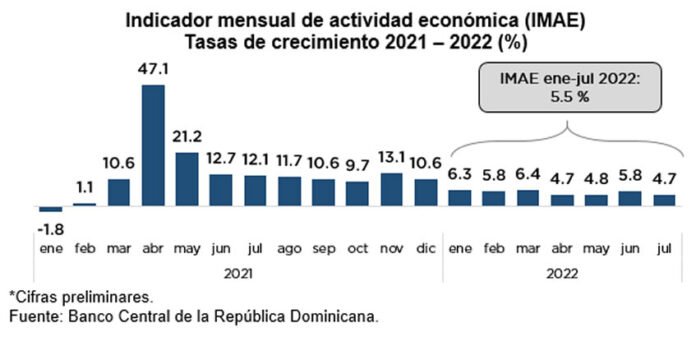 El indicador mensual de actividad económica (IMAE) registra una variación promedio acumulada de 5.5 % en el periodo enero-julio 2022 en comparación con igual período del año anterior, luego de haber experimentado un aumento interanual de 4.7 % en el mes de julio, similar a las tasas de crecimiento de abril y mayo de 4.7 % y 4.8 %, respectivamente.