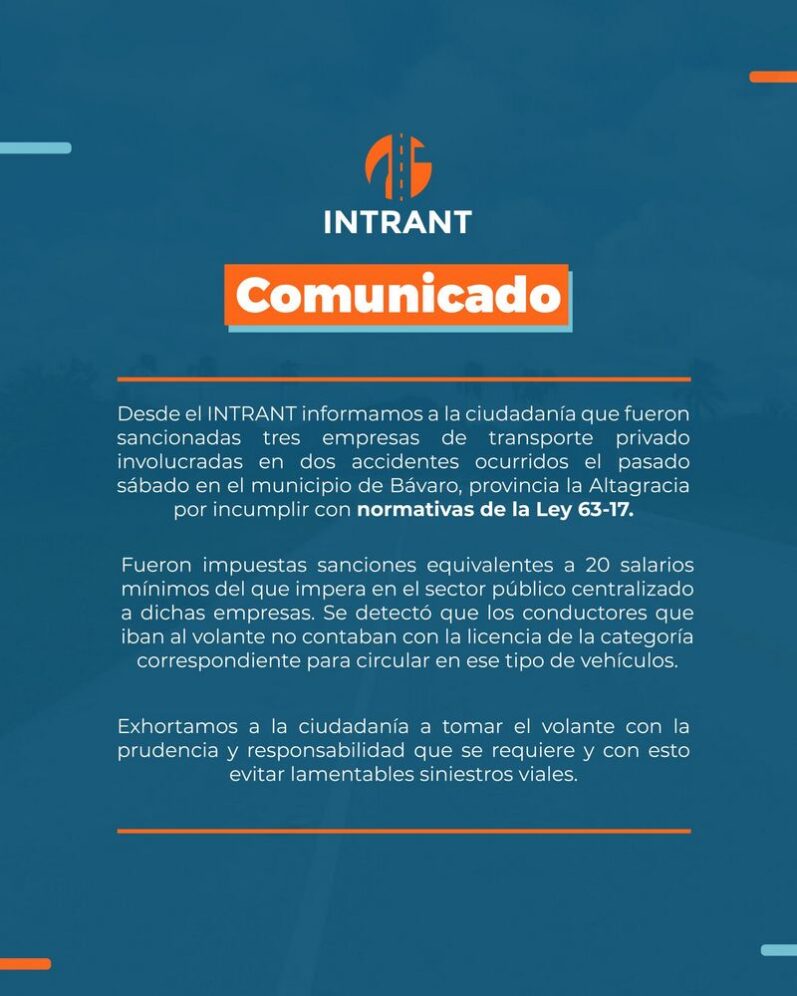 Punta Cana, RD.- El Instituto Nacional de Tránsito y Transporte (INTRANT) informó a través de un comunicado que: “Desde el INTRANT informamos a la ciudadanía que fueron sancionadas tres empresas de transporte privado involucradas en dos accidentes ocurridos el pasado sábado en el municipio de Bávaro, provincia la Altagracia por incumplir con normativas de la Ley 63-17”.