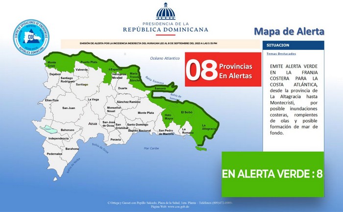 El COE coloca 08 provincias en alerta verde por posible inundaciones costeras, rompientes de olas y formación de mar de fondo, porque los efectos indirectos asociados al movimiento del Huracán Lee por el Atlántico se deteriorará significativamente en el oleaje y en el viento.