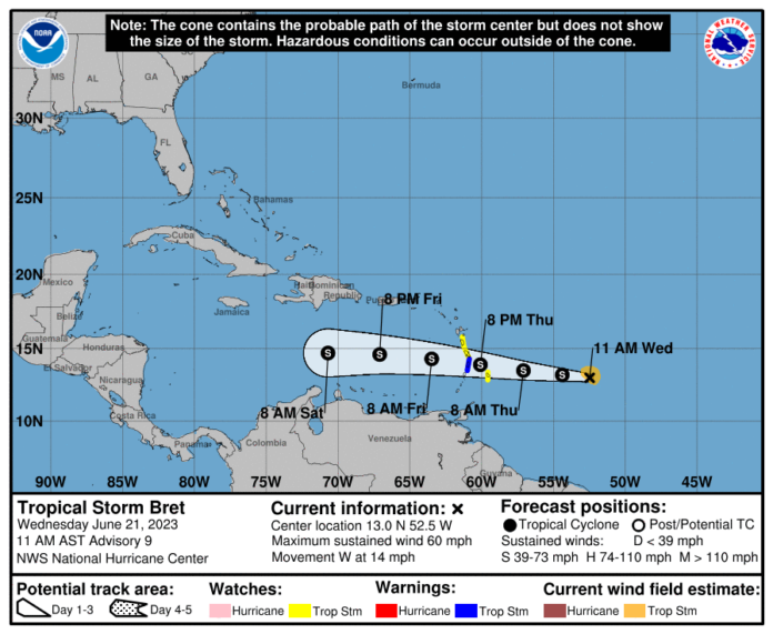 Miami.- El Centro Nacional de Huracanes, en su boletín de las 8 de esta mañana indica que según la trayectoria de pronóstico, se espera que el centro de la Tormenta Tropical Bret se mueva a través de sectores de las Antillas Menores el jueves por la tarde y noche, y luego se mueva a través del Mar Caribe este el viernes.