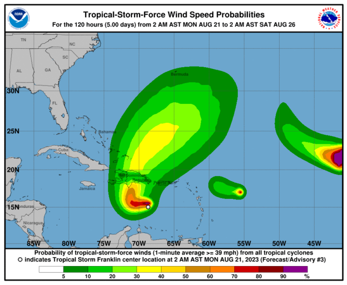 El meteorólogo Jean Suriel advierte sobre el fortalecimiento de Franklin en las ultimas horas indicando que ha ganado intensidad sobre el Mar Caribe, alcanzando vientos máximos sostenidos de 85 km/h, y que a su vez disminuyó su traslación hasta los 19 km/h. lo que indica el fortalecimiento de la tormenta dentro de las próximas horas.