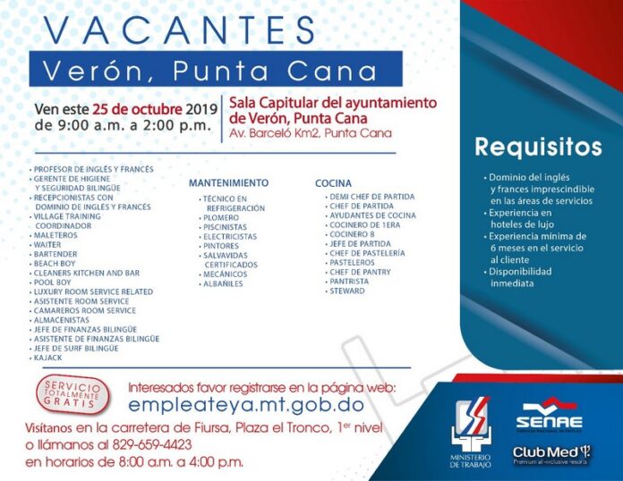 Punta Cana, R. Dominicana.- El Ministerio de Trabajo, a través del Servicio Nacional de Empleo (SENAE), invita a las personas interesadas a participar en la Jornada de Empleo para una empresa del área hotelera de Miches, que se realizará este viernes 25 de octubre 2019, en horario de 9:00 a.m. a 2:00 p.m., en el Ayuntamiento de Verón, Punta Cana, ubicado en la Ave. Barceló Km 2 de esa ciudad.