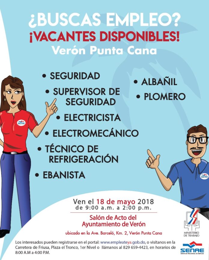 Bávaro, R. Dominicana.- El Ministerio de Trabajo, a través del Servicio Nacional de Empleo (SENAE), invita a las personas interesadas a participar en la Jornada de Empleo que se realizará para Empresa de Servicios, en Punta Cana.