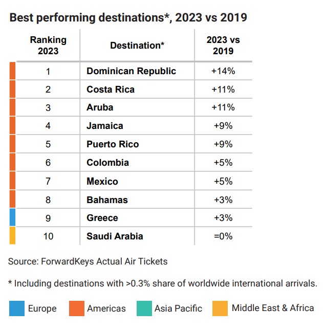 El informe Tendencias de viajes globales de 2023 presenta 21 páginas de información e información sobre viajes que utilizan los datos más recientes sobre emisión de boletos aéreos de ForwardKeys, además de las clasificaciones globales de destinos de 2023, también por región.