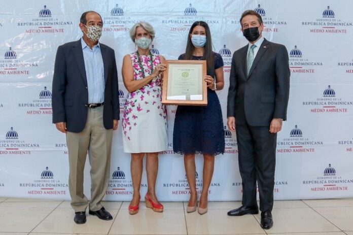 La certificación fue entregada por el ministro de Industria y Comercio, Víctor Bisonó, José Ramon Reyes, viceministro de Recursos Costeros y Marinos Del Ministerio de Medio Ambiente, y Ginny Heinsen, gerente general de Sostenibilidad 3Rs, a Laura Valerio, gerente de Imagen Institucional.