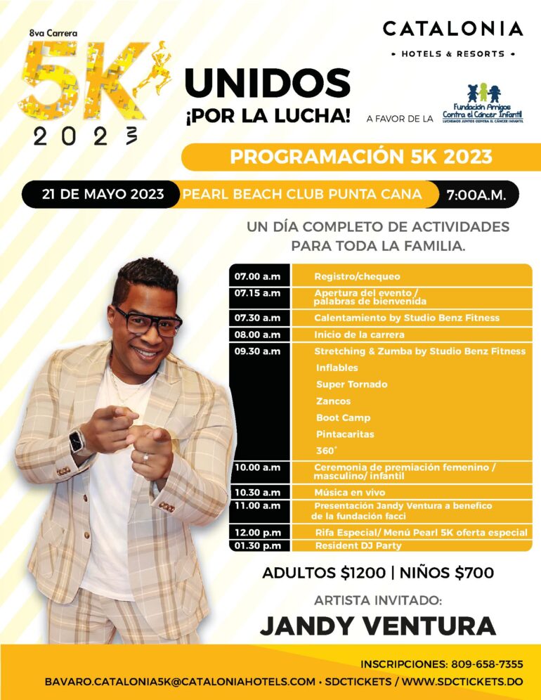 La Carrera Catalonia 5K se llevará a cabo el próximo domingo 21 de mayo a partir de las 7:00 am en el Pearl Beach Club, en la zona de Bávaro, Punta Cana, en la provincia de La Altagracia. Este año se realizará nuevamente de manera simultánea en República Dominicana, México y España, manteniendo su nivel de carrera internacional; con el propósito de llevar alegría y apoyo a los niños de la Fundación Amigos contra el Cáncer Infantil.