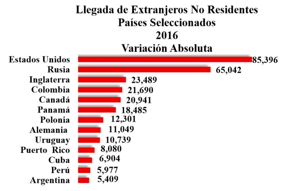 En la llegada de pasajeros según residencia en diciembre de 2016 se destacan los incrementos de los flujos turísticos interanuales procedentes de Rusia (14,622), Canadá (4,845), Argentina (4,188), Francia (3,132), Panamá (2,993) Inglaterra (2,197) y Bélgica (1,430).