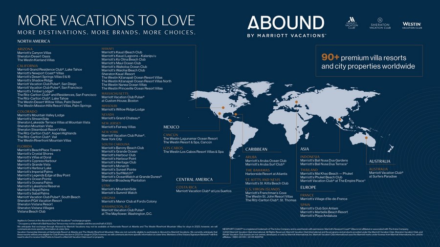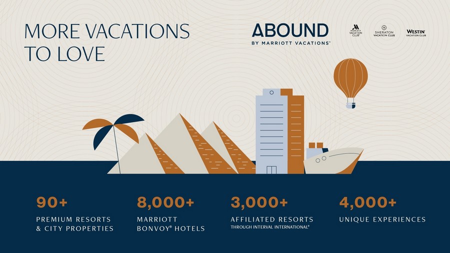 Abound by Marriott Vacations™ brinda acceso a más de 90 resorts de club de vacaciones en Marriott Vacation Club®, Sheraton® Vacation Club y Westin® Vacation Club, así como acceso a más de 8,000 hoteles Marriott Bonvoy, 2,000 casas de vacaciones y 2,000 experiencias únicas como cruceros, recorridos culinarios y guiados, eventos de primer nivel, aventuras al aire libre y más con una capacidad continua de intercambio a través de Interval International, un socio de intercambio de primer nivel.