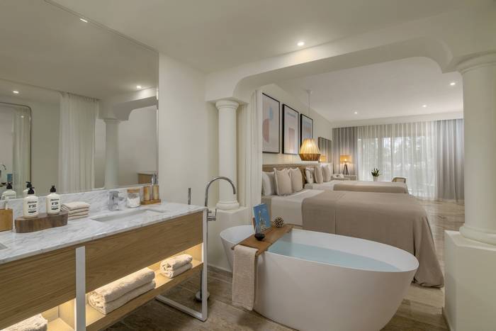 Paradisus Palma Real ha sido rediseñado para integrarse aún más con la naturaleza circundante de Punta Cana. Las 596 suites cuentan con espacios inundados por luz natural, que combinan muebles de madera rústica con tonos tierra, diseñados para proporcionar relajación y serenidad desde el momento en el que los huéspedes llegan.
