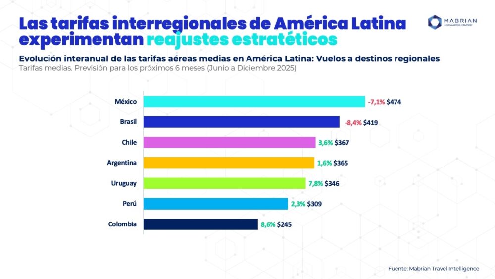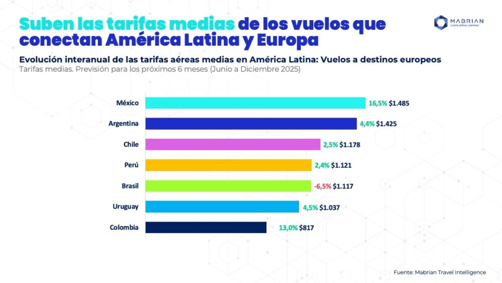 En cuanto a las rutas internacionales dentro de Latinoamérica, las tarifas también muestran variaciones, y oscilan entre USD 245 de media en Colombia, USD 309 en Perú, USD 419 en Brasil, y USD 474 en México. En la comparación interanual, destacan los aumentos de tarifas medias en Colombia (+8,6%) y Uruguay (+7,8%), mientras que Argentina (+1,6%), Perú (+2,3%) y Chile (+3,6%) presentan subidas más moderadas.