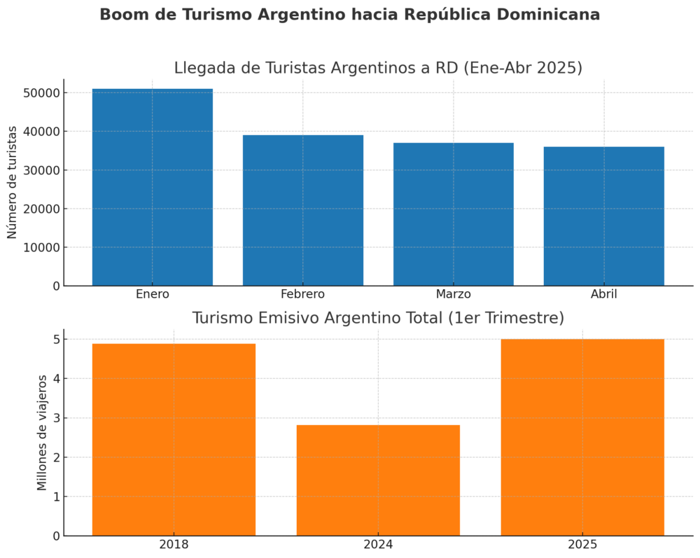 De acuerdo con cifras oficiales del Ministerio de Turismo de República Dominicana, el país recibió más de 163,000 turistas argentinos entre enero y abril de 2025. Solo en enero llegaron más de 51,000 visitantes, seguidos de 39,000 en febrero, 37,000 en marzo y 36,000 en abril, lo que representa uno de los crecimientos más significativos en llegadas internacionales al destino caribeño.