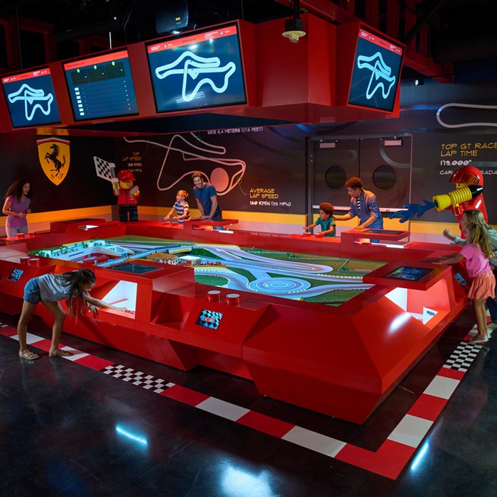 Una vez en la «pista», LEGO Ferrari Build and Race está diseñada para ser interactiva y desafiante, ya que los corredores tendrán que adaptarse a condiciones cambiantes del circuito como el clima, el viento, la temperatura y la velocidad del viento. Los pilotos tendrán tres vueltas para establecer su tiempo más rápido, y utilizarán paneles táctiles para darle a su automóvil una aceleración extra y para rebasar a los contrincantes en las rectas. Las familias pueden unirse a la diversión observando los monitores de techo con vista superior de la acción y los tableros de posiciones que muestran el estado de las carreras actuales y destacan a los corredores con mejor desempeño del día.