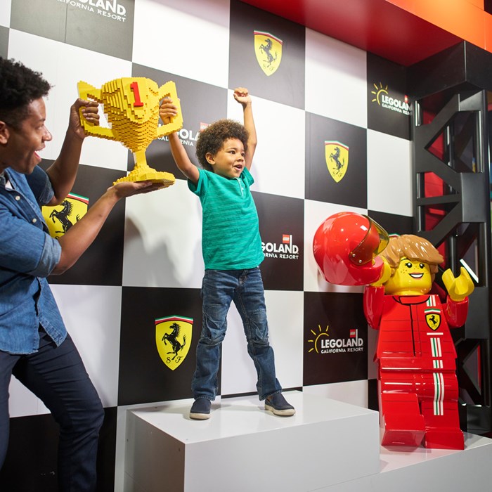 LEGO® Ferrari Build and Race les permite a los visitantes construir, probar y competir con su propio LEGO Ferrari. Tras inspirarse con los datos curiosos, las historias de carreras y los premios de Ferrari que se presentan en el «garaje», los jóvenes corredores pueden echar a andar su creatividad mientras se dirigen al área de construcción y pruebas para crear su propio auto LEGO Ferrari y competir en una de las tres pistas de pruebas: la zona de pruebas, la pista de la pruebas de dirección y la pista de la pruebas de velocidad. Cada pista ofrece a los corredores diferentes obstáculos, desafíos y la oportunidad de registrar el mejor tiempo.