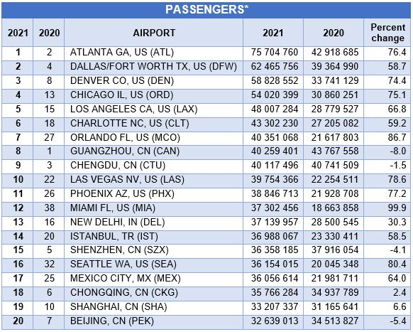 En 2021, los aeropuertos del mundo recibieron 4.600 millones de pasajeros, lo que representa un aumento del 28,3 % con respecto a 2020 o una caída del 49,5 % con respecto a los resultados de 2019. Los 20 principales aeropuertos, que representan el 19 % del tráfico mundial (863 millones de pasajeros), experimentaron una ganancia del 42,9 % desde 2020 o una caída del 31,9 % con respecto a sus resultados de 2019 (1270 millones de pasajeros en 2019).