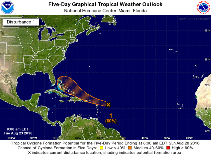 Las condiciones ambientales podrían tornarse más favorables para finales de esta semana mientras el sistema se mueva cerca de la Española (República Dominicana-Haití) y luego al sureste y centro de las Bahamas.