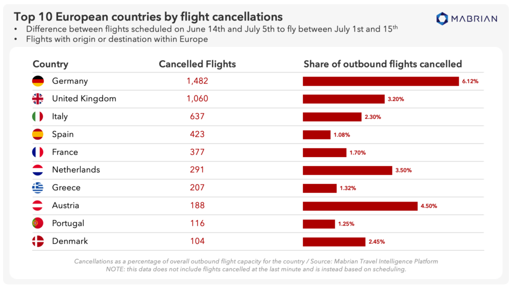 Sin embargo, el mayor impacto está en Alemania con un 6 %, por lo que, si bien eso significa que 19 de los 20 vuelos siguen programados, no debemos olvidar que la conectividad alemana ha sido más lenta que la mayoría en la recuperación hasta 2019, por lo que esto podría retrasar aún más la recuperación.