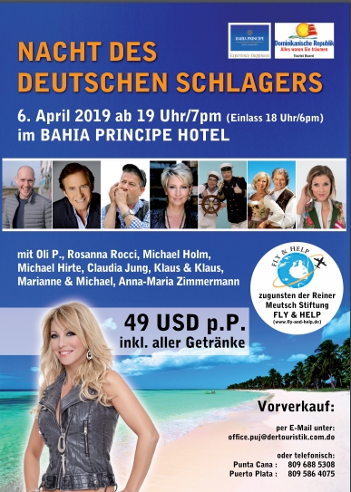 Bávaro, R. Dominicana.- Por sexto año consecutivo celebrarán la exitosa serie de conciertos a beneficios «Noche del Schlager Alemán» a favor de la Fundación FLY & HELP. El gran evento se llevará a cabo en los hoteles Bahía Príncipe de Playa Bávaro, el día 6 de abril desde las 19 hs. Se espera las actuaciones de las estrellas TOP de Alemania Schlager: Oli P., Rosanna Rocci, Michael Holm, Claudia Jung, Michael Hirte, Klaus y Klaus, Marianne y Michael, Graham Bonney y Anna-Maria Zimmermann