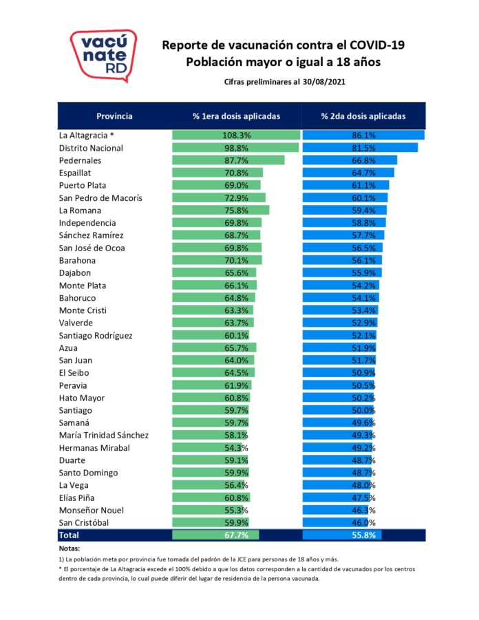 Las demarcaciones que le siguen en cantidad de vacunados son: Distrito Nacional (Santo Domingo) con el 98.8% de su población con primera y el 81.5% con segunda dosis; Pedernales con 87.7% de primera y 66.8% con segunda; Puerto Plata con 69% de primera y el 61.1% con segunda dosis.