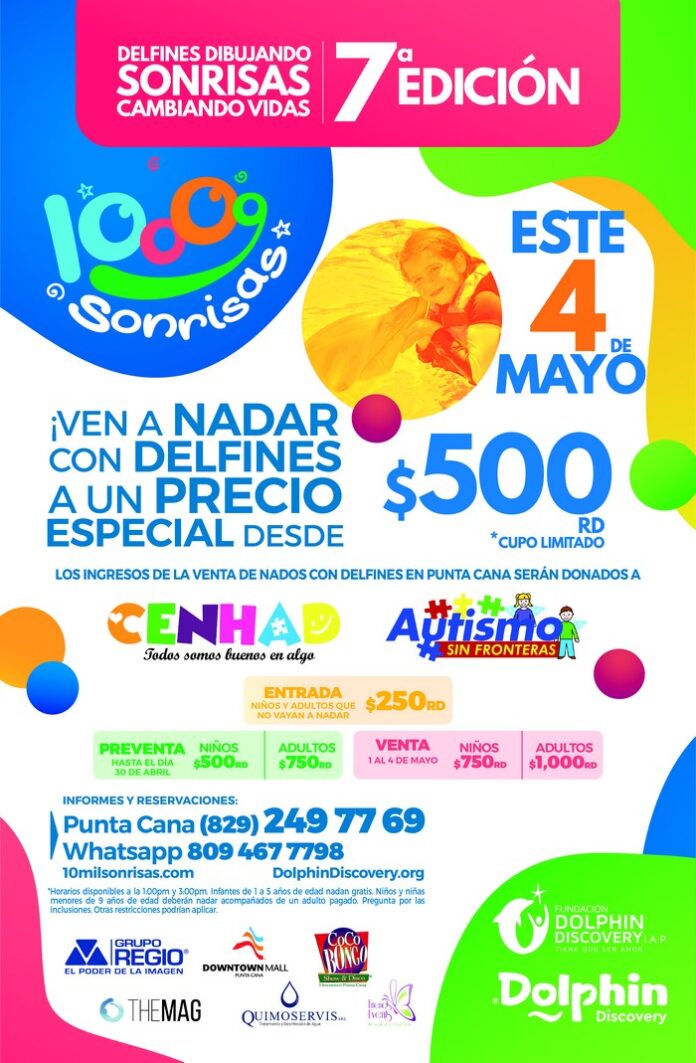 Bávaro, R. Dominicana.- Este sábado 4 de mayo de 2019 Dolphin Discovery Punta Cana invita a interactuar con delfines, en el marco de la 7ª Edición de su programa de responsabilidad social “10,000 SONRISAS”.
