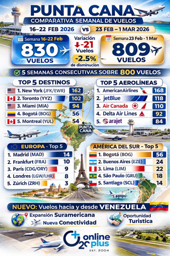 Punta Cana, RD. – El Aeropuerto Internacional de Punta Cana (PUJ) registra una leve variación en su programación aérea al pasar de *830 vuelos en la semana del 16 al 22 de febrero de 2026 a *809 vuelos programados para la semana del 23 de febrero al 1 de marzo de 2026.