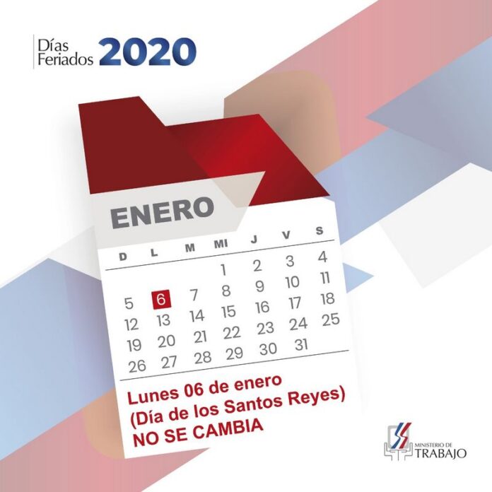 Santo Domingo, R. Dominicana.- El Ministerio de Trabajo reitera a toda la colectividad empresarial y trabajadora de la República Dominicana que el lunes 06 de enero “Día de los Santos Reyes”, no se cambia, por lo que no se trabaja.
