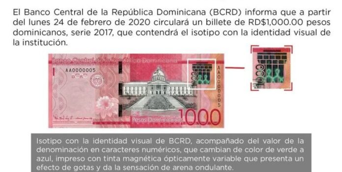 Santo Domingo, R. Dominicana.- El Banco Central de República Dominicana informó que a partir del próximo lunes 24 de febrero se pondrá en circulación un billete de RD$1,000 dominicanos de la serie 2017.