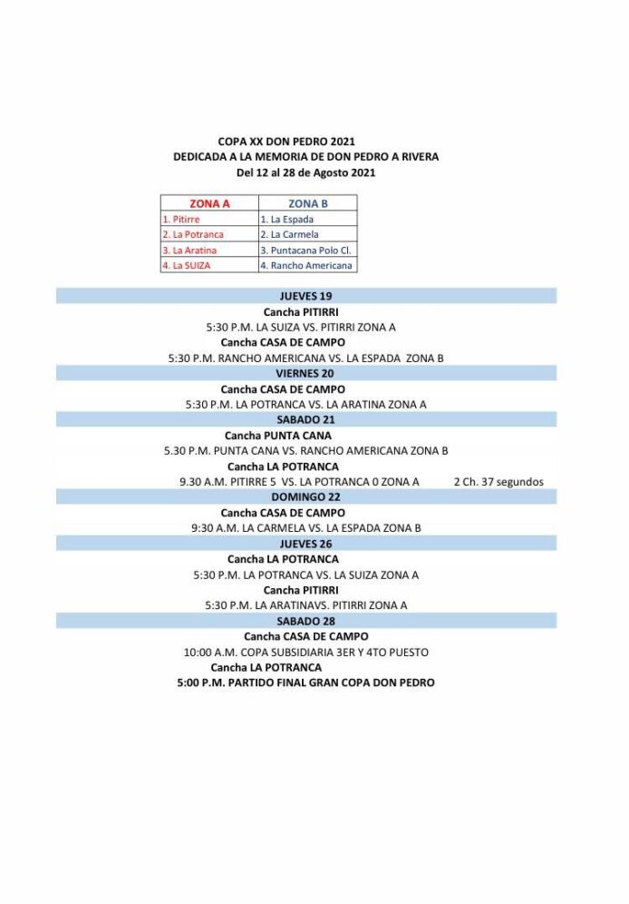 Las acciones del torneo prosiguieron el domingo 15 en la Cancha Pitirre, donde el local se midió con La Suiza, para el jueves 19 se programó en Casa de Campo Polo Club el partido entre La Aratina vs Pitirre y el viernes 20, en Polo Club Punta Cana, el local vs Rancho Americana, entre otros juegos. La gran final se disputará el sábado 28 a las 5 pm, en la cancha La Potranca.